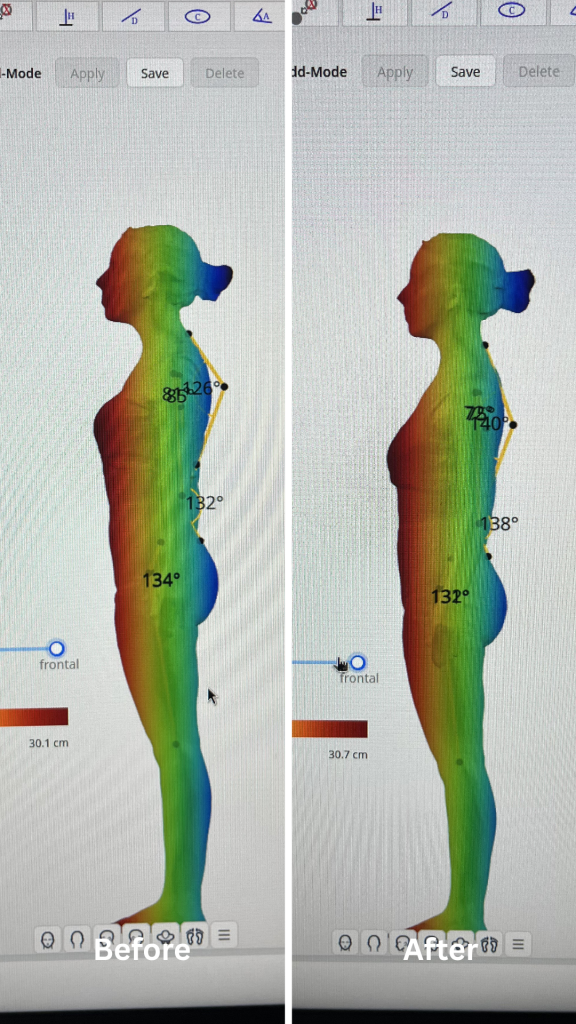 Lumbar curvature improved toward neutral alignment from 117° to 137°